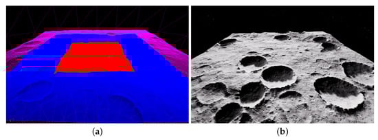Lunar terrain simulation model map: (a) Lunar surface terrain mesh refinement model map. The size of the red area is 10 km × 10 km, where each square grid size is 25.6 cm. The size of the blue area is 25 km × 25 km, where each square grid size is 2.56 m. The size of the blue area is 40 km × 40 km, where each square grid size is 256 m. (b) Lunar terrain camera rendering map.