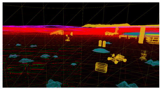 Additionally, we added some artificial structures to develop lunar exploration base construction scenarios or deep exploration scenarios, which include buildings and equipment instruments to create more complex lunar scene features. Each of these characteristics is depicted using realistic mesh models, enabling the generation of more precise 3D disparity and depth maps in later phases of the project. The wireframe of the scene objects is shown in Figure 2.