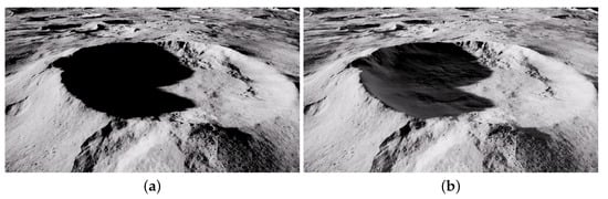 The lunar surface, covered by low albedo and retroreflective regolith, significantly affects its reflectivity. The illumination conditions are influenced by the absence of atmospheric and the unique properties of the regolith, resulting in strong lighting with extremely long shadows and high dynamic illumination range. To accurately simulate these conditions, we used ray tracing to create reflection lighting effects within craters, rock shadows, and objects like rovers. We optimized the lighting model to better represent the lunar surface’s dynamic range of illumination. The original model relied solely on direct sunlight, resulting in completely black-shadowed areas, unlike real lunar images where light reaches shadowed regions through surface scattering, earthshine, and starlight. Consequently, we introduced an enhanced ray tracing model that provides low-intensity light source compensation for shadowed areas and adjusted the intensity and angle of sunlight. We modeled the color temperature, irradiance, and angular diameter of the sun to more accurately simulate the lighting conditions of the lunar polar regions. The comparison between the original illumination model and the improved illumination model is shown in Figure 3.