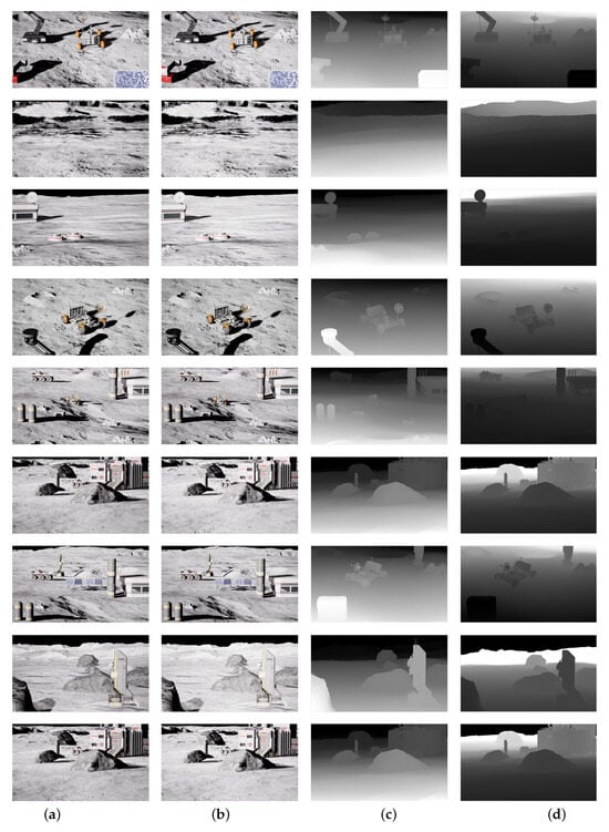 In the created stereo vision system, the camera model follows the pinhole camera model with a focal length of 70 mm, a baseline distance of 300 mm, and a resolution of 1920 × 1080. The cameras are positioned approximately 8 m above the lunar surface, capturing images from a tilted downward view. This setup simulates the scenario of a stereo vision system deployed at a lunar base in the polar regions of the Moon for scene exploration and environmental monitoring. Ultimately, we generated multiple sets of lunar surface images and their corresponding depth and disparity ground truth maps under varying distances and conditions, as illustrated in Figure 4. These images will be used for the design and validation of the proposed algorithms.