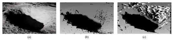 Stereo matching algorithms can be categorized into two main types based on their constraints and search strategies []: local algorithms and global algorithms. Local algorithms compute and aggregate costs using information such as image intensity or gradient within a defined search range [,,]. They then generate the disparity map using the winner-takes-all (WTA) strategy. For example, NASA’s Spirit and Opportunity rovers utilized a correlation-based window stereo matching algorithm []. However, these methods are highly sensitive to variations in image brightness. To address this issue, stereo matching algorithms based on the Sum of Absolute Differences (SAD) and Sum of Squared Differences (SSD) were later developed and widely adopted. For example, the Jet Propulsion Laboratory (JPL) employed an improved SAD algorithm for detecting planetary slopes and rocks []. Meanwhile, reference [] used SSD to estimate the DEM of the planetary surface. Despite their widespread use, these two algorithms exhibit limited robustness when dealing with the sparse textures and extreme lighting conditions typical of lunar scenes, resulting in low disparity estimation accuracy. Traditional local window matching algorithms determine the match for the central pixel by comparing the grayscale similarity of neighboring pixels within the window. This approach is prone to errors due to projection distortions that cause grayscale values within the window to misalign, and the pixel-by-pixel calculation is time-consuming. To mitigate these issues, Zalih proposed non-parametric rank and Census algorithms []. These algorithms rely on pixel information but replace absolute information with relative information, reducing the impact of gain and bias and partially addressing the illumination problem. The Tianwen-1 stereo camera employs a sparse Census transform to alleviate grayscale variations caused by uneven lighting []. However, challenges remain in accurately estimating disparities in regions with extensive shadow occlusion and weak textures. Overall, these local methods perform poorly under the specific lighting conditions, weak textures, and shadow occlusions encountered in lunar scenes, making them less effective for stereo matching in complex lunar environments.