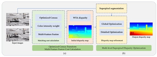 Workflow of the proposed method. On the far left is our input stereoscopic image pair of the moon scene: (a) The process of our proposed optimized Census transform multi-feature fusion cost calculation. (b) The process of the multi-layer superpixel disparity optimization.