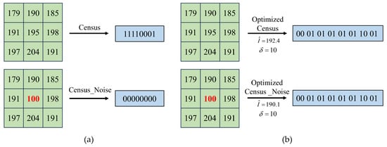 Comparison of optimized Census transform and original Census transform in weakly textured areas: (a) The effect of noise on the original Census transform. (b) The effect of noise on the optimized Census variation method.