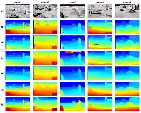 Disparity estimation results for test images of the lunar research stations scene dataset. (b–f) represent the disparity estimation images of different methods in scenes 1–5 respectively. (a) Original image. (b) Disparity image obtained by SGM. (c) Disparity image obtained by StereoBM. (d) Disparity image obtained by AD Census. (e) Disparity image obtained by MC-CNN. (f) Disparity image obtained by Our method. (g) Ground truth disparity maps.