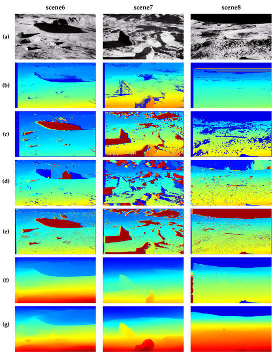 To thoroughly validate the effectiveness of the proposed method, we compared it with several other approaches, including SGM [] and StereoBM [,] algorithms which are widely used in the field of planetary exploration, AD-Census [], which [] has been a prominent stereo matching algorithm, and the deep learning-based method MC-CNN [].