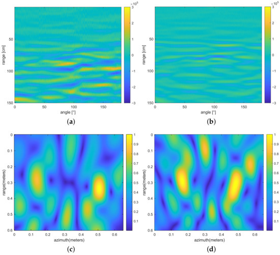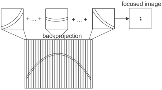 where ifft(.) represents the fast inverse Fourier transform and K represents a scaling factor. Applying Equation (15) for each pulse and zero-padding the data so that the inverse fast Fourier transform (ifft) length becomes is the first stage in creating an image. Hence, for all , and