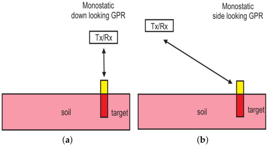 Different configuration of the transmitter and receiver. (a) Monostatic GPR, (b) monostatic side-looking GPR.