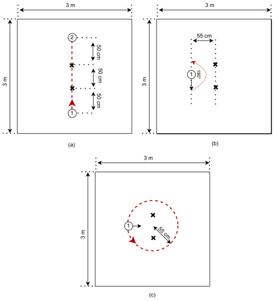 The scenarios for the three experiments are shown in Figure 11 and are depicted as top-down views within a 3 × 3 m polygon. Corner locations are marked with an ‘x’, and the starting position of the antennas is indicated by a circled ‘1’. The trajectory of the platform in the down-looking configuration spanned 150 cm (Figure 11a, marked with a red dashed line). The platform was moving at a speed of 2 cm/s, leading to a total data collection time of 75 s. The starting position is marked as ‘1’, and the end position as ‘2’. In the side-looking configuration where the platform rotated around the z-axis (Figure 11b), the data collection time was 86 s and the angular rotation speed was around 2.1 °/s. For the side-looking circular measurements (Figure 11c), the trajectory was 345 cm long, and had the same movement speed of 2 cm/s; the data collection time was 172 s. As the circular trajectory was performed, the start and end points were the same. The antennas were directed toward the center, with the initial orientation marked by an arrow pointing outward from the circled ‘1’. The circular trajectory is marked in a dashed red line.