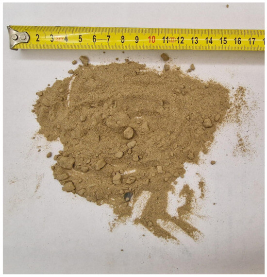 The soil volumetric moisture was 5% on the top of the polygon and 14% at the bottom of the polygon at a temperature of 21 °C. The soil moisture was measured using SWM-5000 soil moisture meter [33]. The soil is depicted in Figure 12, and has a very small granular structure of 0.1 mm. The test material was a mixture of sand (90%) and clay (10%). Pure sand typically has a dielectric constant ranging from 2 to 3, while the dielectric constant of clay is much higher, typically ranging from 5 to 15. Given that there is a high proportion of sand and an absence of moisture, a lower dielectric constant is expected, possibly in the range of 2 to 5. A low moisture level indicates lower loss compared to wet soil, as the water in the soil absorbs more energy from waves passing through, leading to greater attenuation.