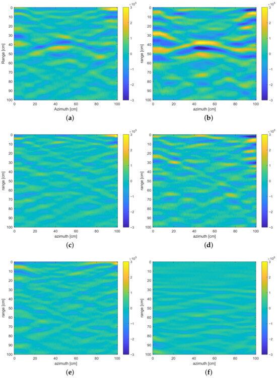 B-Scans with removed background of targets buried at different depths. (a) B-scan of target buried at 0.4 m using VV polarization. (b) B-scan of target buried at 0.4 m using HH polarization. (c) B-scan of target buried at 0.6 m using VV polarization. (d) B-scan of target buried at 0.6 m using HH polarization. (e) B-scan of target buried at 0.8 m using VV polarization. (f) B-scan of target buried at 0.8 m using HH polarization.
