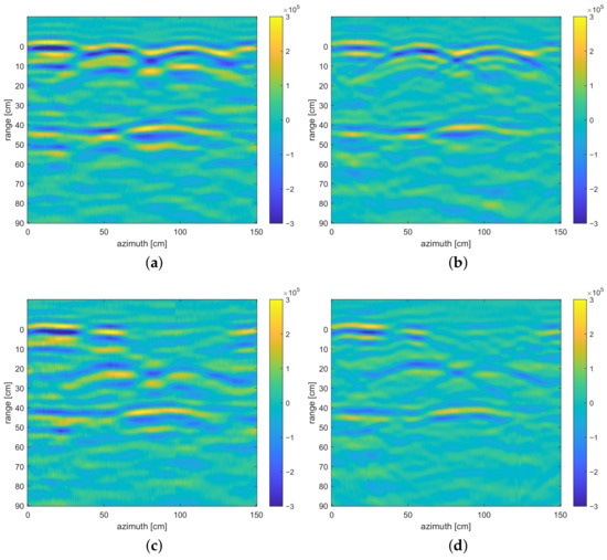 In Figure 14, B-scans obtained using the monostatic down-looking configuration are depicted. The effective coverage area extends to 2.7 m in the azimuth direction and approximately 0.1 m in the range direction. Corners were separated by 0.5 m. The hyperbolic reflections from the corners provide a clear indication of the radar system’s ability to capture and interpret subsurface features in a down-looking configuration. The effective coverage dimensions underscore the system capability to scan a specific area with precision, contributing to a detailed and accurate representation of the subsurface environment. Figure 14a–d show that the target signature is the most visible in the VV polarization, although the amplitude is approximately two-times smaller compared with the case of VV polarization.