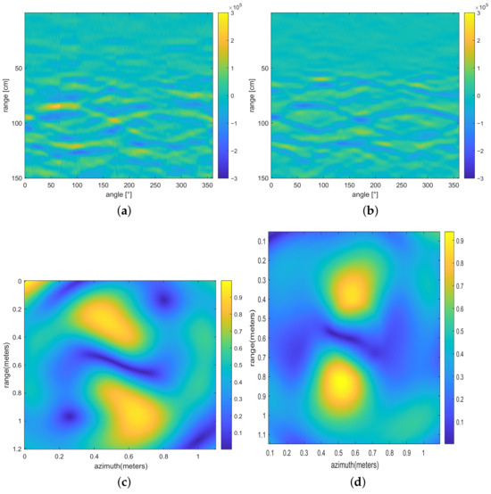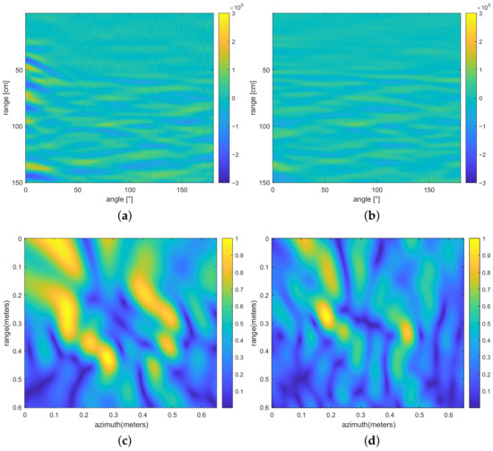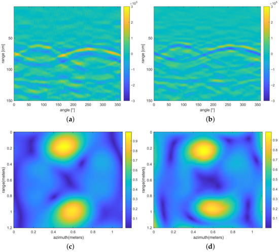 (a) B-scan of circular GPR using HH polarization and background removal. (b) B-scan of circular GPR using VV polarization and background removal. (c) Focused image using HH polarization and BP algorithm. (d) Focused image using VV polarization and BP algorithm.