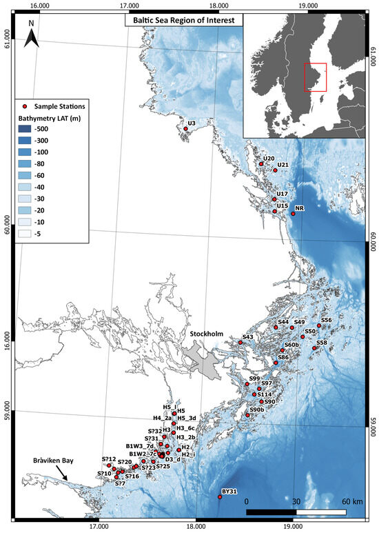 Map of the NW Baltic Sea ROI showing the matchup validation sample stations for the Sentinel-3 OLCI water products (within ±3 h) after the application of OLCI data quality flags. The red bounding box represents the ROI. All samples are >434 m from land, as noted in Section 2.2.1. Bathymetry data: [22]; Coastline Polyline: [23]; Countries Polygon: [24]; Stockholm Polygon: [25].
