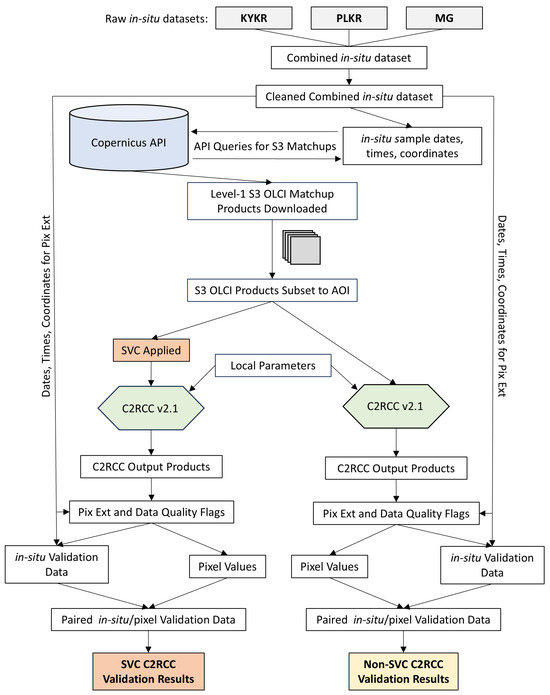 C2RCC v2.1 validation workflow diagram for both the SVC and non-SVC regionally adapted C2RCC processing chains. The C2RCC v1.0 processing workflow was identical, apart from the processor version. The default, non-regionally adapted, C2RCC parameters were also validated. “KYKR” refers to the in situ dataset from Kyryliuk and Kratzer [15], “PLKR” refers to the Kratzer and Plowey [16] dataset, and “MG” is the Swedish National Marine Monitoring Program (SwAM) dataset. “Pix Ext” refers to “Pixel Extraction”.
