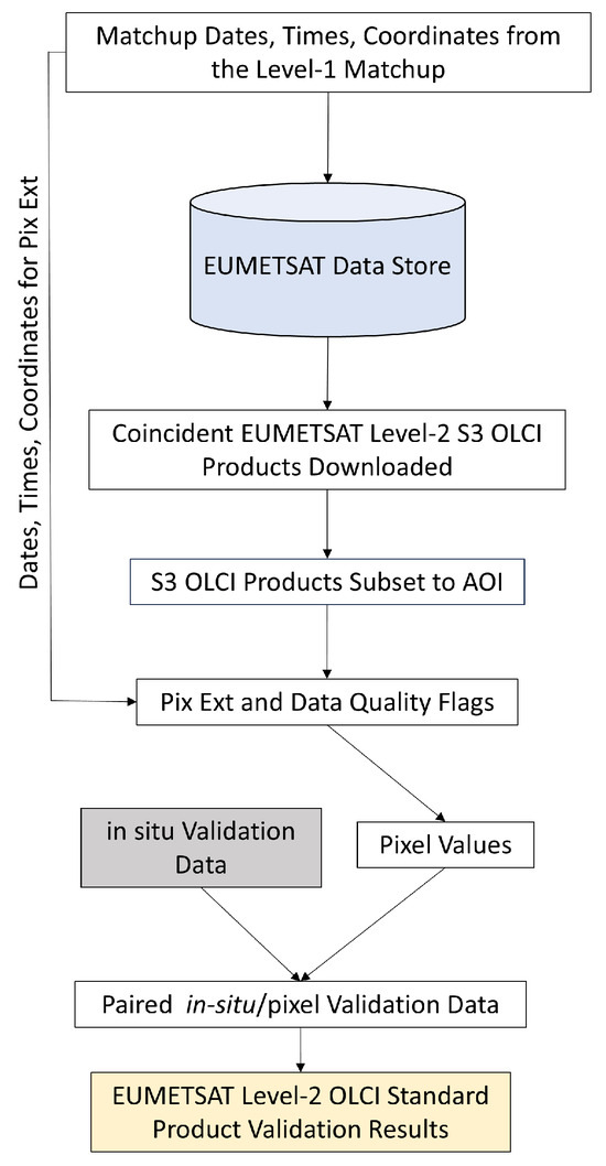 EUMETSAT Level-2 Sentinel-3 OLCI-A and OLCI-B Level-2 standard products validation workflow diagram. “Pix Ext” refers to “Pixel Extraction”.