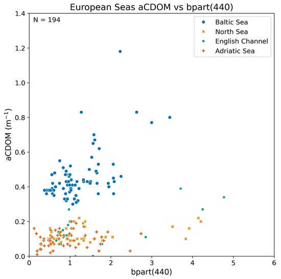 Figure 6 shows the relationship between CDOM absorption (aCDOM) and particle scatter (bpart) at 440 nm for the Baltic Sea, North Sea, English Channel, and the Adriatic Sea. As can be seen, this relationship is very different in the Baltic Sea compared to the other European Seas. For the same bpart at 440 nm values, the Baltic Sea’s aCDOM (m−1) values were found to be much higher than those of the North Sea, English Channel, and Adriatic Sea.