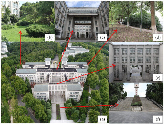In addition, the building is constructed on low-lying land on a hillside, which complicates the UAV survey. There are large slopes on the east and west sides, as shown in Figure 4b,d. The terrain elevation difference between the south (low) and the north (high) area of the building is about 10.8 m, and a long staircase connects them, as shown in Figure 4f.