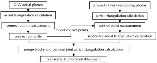 To improve the quality of the real-scene 3D model, we fused photos from the UAV and ground camera to build the 3D model. ContextCapture v4.4.12 software from the Bentley company was used to perform the process, including the aerial triangulation, corresponding point matching, and other operations, as shown in Figure 8.