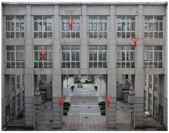 The choice of tie points is critical and should be prominent and more accessible to identify, such as apparent signs, building corners, and building connections. The tie points should be evenly distributed to cover the entire modeling area. Since most of the study area has windows, gray-white walls, and columns, it was not possible to select the tie points on the transparent glass and the walls directly without any apparent signs. We chose the intersection of the window edges, the starting point, or end point of the concave and convex lines on the column that was easy to identify. A total of five tie points were selected, as shown in Figure 9. We ensured that each tie point was contained in three–five photos so the study area could be observed and reconstructed from different angles.
