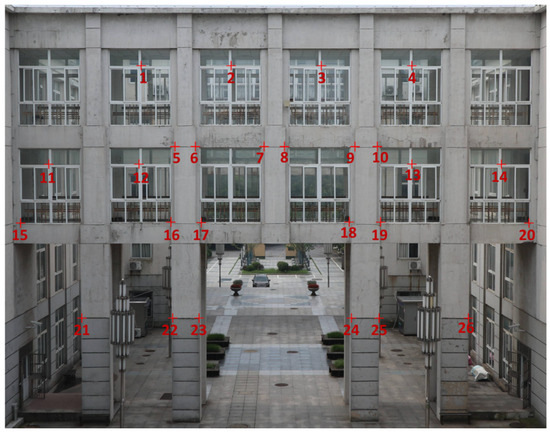 We selected the intersection of window edges, the starting point or end point of the bump line on the column, and the corner point of the window as feature points to ensure the operability of the coordination measurement. A total of 26 feature points was selected and numbered from left to right and from top to bottom, as shown in Figure 10.