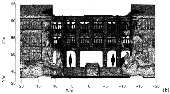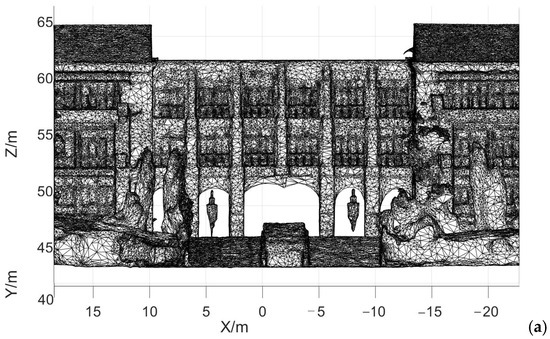 After the real-scene 3D model was established, the triangular mesh of the building was created, as shown in Figure 13. As shown in the triangular mesh diagram, the number of triangular meshes in the fused model is more significant. The shape of the bottom of the corridor and the columns is more regular.