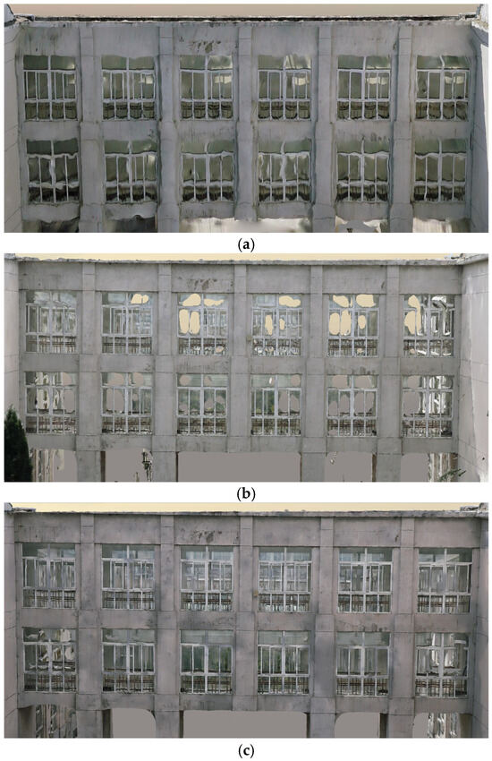 In the UAV-only model, the columns are severely deformed, the windows appear hollow and lack clear texture, and the bottom of the corridor also appears hollow. By comparing the details, edges, and surface quality of the corresponding regions in the fused model, as shown in Figure 12, it is found that the column does not show severe deformation. There are no “holes” in the windows, and the geometry is more complete. There is no adhesion from the window to the eaves. The contour at the bottom of the corridor is relatively complete, and the part connected with the column is structured. Overall, the fused model has a sharper outline and texture. The quality of the poor parts of the initial model, such as windows, eaves, and the bottom of the corridor, is improved. A high ratio of restoration of the building itself is realized.