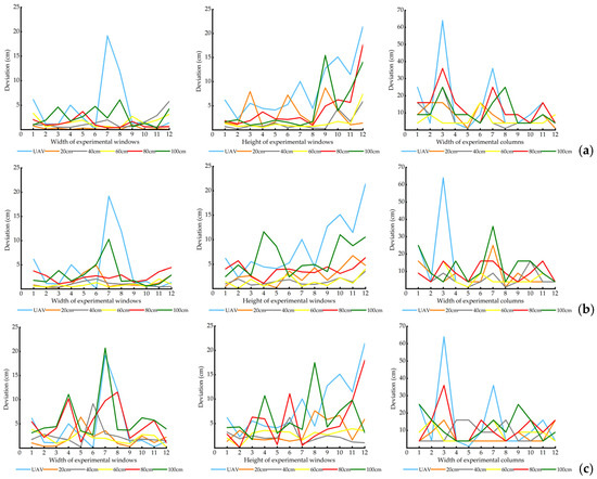 Deviation between the actual and modeled values of 12 experimental objects under different overlap interval distances and reshooting distances: (a) deviation in the experimental objects under a reshooting distance of 40 m; (b) deviation in the experimental objects under a reshooting distance of 45 m; and (c) deviation in the experimental objects under a reshooting distance of 50 m. Each point on the horizontal axis represents each experimental object; the value on the vertical axis represents the enlarged deviation value. Light blue represents the UAV model; orange represents the fused model with a 20 cm overlap interval distance (about 70% overlap ratio); gray represents the fused model with a 40 cm overlap interval distance (about 30% overlap ratio); and yellow represents the fused model with a 60 cm overlap interval distance (0% overlap ratio).