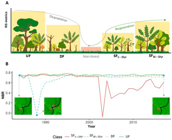 (A) Schematic representation of the variation of a hypothetical remote sensing (RS) metric from LiDAR and HSI in the four classes of vegetation degradation and regeneration considered in this study: undisturbed old-growth forests (UFs); degraded old-growth forests (DFs); younger second-growth forests (SF1–15yr); and older second-growth forests (SF16–32yr). We highlight that some RS metrics may present different patterns of variation; for example, albedo presents an inverse variation of that shown in the figure. (B) Example of time series of the Normalized Burn Ratio (NBR) calculated from Landsat data (1984–2017), indicating clearing events in 1988 and 2003, followed by vegetation recovery in the subsequent years. The inset images are TM/Landsat-5 and OLI/Landsat-8 color composites with bands 6 (red), 5 (green), and 4 (blue). The Landsat band number was standardized to the Landat-8 pattern for consistent comparison between the sensors.