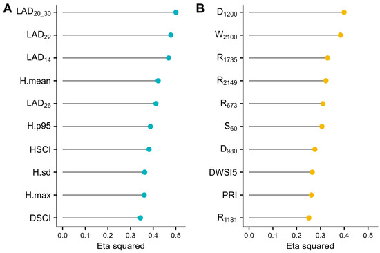 Top 10 LiDAR (A) and HSI (B) metrics ranked according to eta squared (η2[H]). See Table 4 for the description of metrics.