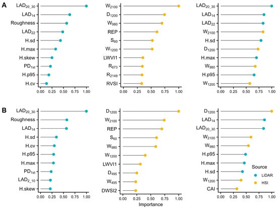 Relative importance of the 10 highest ranked metrics for the (A) RF and (B) SGB classifiers as a function of the LiDAR (left), HSI (center), and hybrid (right) datasets. See Table 4 for the description of metrics.