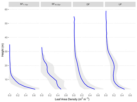 Leaf Area Density profile for each class of vegetation disturbance. Blue lines are mean values from all samples, while gray areas represent the standard deviation.