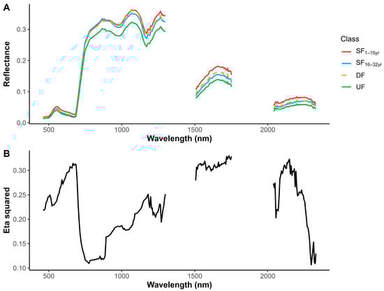 (A) Average AISAFenix surface reflectance spectra of each studied class and (B) eta squared (η2[H]) for all reflectance bands. Missing data around 1400 nm and 1900 nm refer to spectral intervals of strong atmospheric water vapor absorption.