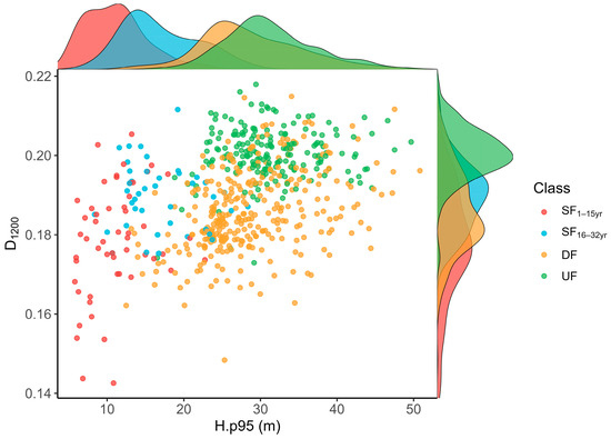 Scatterplot relating an HSI metric (D1200 = depth of the 1200 nm absorption band) to a LiDAR metric (H.p95 = 95% percentile of height). Points are colored according to the vegetation class. The density plot of each metric is also shown on the respective axis.