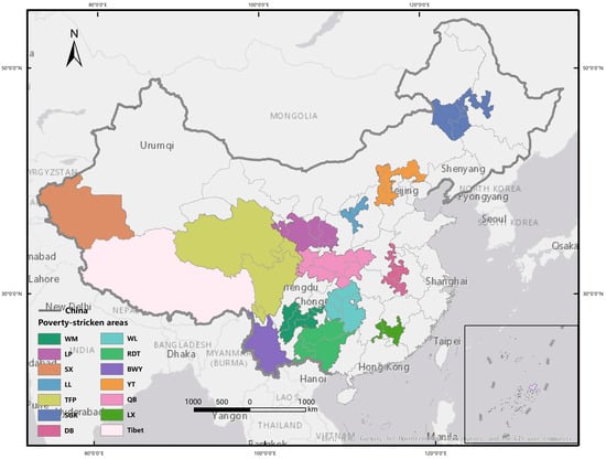 Study area. Fourteen poverty-stricken areas in China. WM—Wumeng; LP—Liupan; SX—south area of Xinjiang; LL—Lvliang; TFP—Tibetan area of four provinces; SGK—south area of Great Khingan; DB—Dabie; WL—Wuling; RDT—rocky desertification of three provinces; BWY—border area of western Yunnan; YT—Yanshan–Taihang; QB—Qinba; LX—Luoxiao.