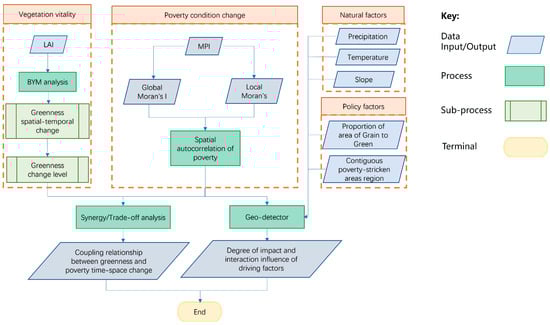 The Resource and Environment Science and Data Centre, Institute of Geographic Sciences and Natural Resources Research, CAS (http://www.resdc.cn/ (accessed on 10 November 2021)), was the data source of meteorological data and land use data used in this work. DEM data were collected from multiple sources to cover this study’s time period, considering that the DEM in parts of the country changed significantly over time. Socio-economic data used in this study were gathered from the China Statistical Yearbook (county-level) (https://data.cnki.net/Yearbook (accessed on 10 December 2021)). Statistical data, including per capita GDP, proportion of tertiary industry, number of teachers per 10,000 people, number of medical beds per 10,000 people, per capita housing area, per capita output of grain, and per capita farmland area, were collected for each poverty-stricken county. We aggregated all raster data, including LAI, meteorology, and DEM data, to each county level with the mean value using the zonal statistic tool of ArcGIS so that it could be consistent with county-level units of socio-economic statistical data. The data descriptions are shown in Table 1. Zhao et al. created a relevant research framework on vegetation viability and power transition in rocky specification areas [], which serves as an important reference and has been further developed in our work. The spatial–temporal analysis method in our framework is the more complicated BYM method. Multidimensional poverty index is used to characterize the comprehensive poverty status, and based on this, LISA clustering map is used to represent the spatial–temporal pattern changes of its poverty status, and a more detailed sub-classified space–time variation has been carried out. Furthermore, Grain for Green Policy, multidimensional poverty status, as well as natural factors were analyzed in the contiguous poverty-stricken areas across China. Based on this, a comparison was made before and after 20 years to observe the changes in influencing factors over the past 20 years. Figure 2 shows the framework applied in this study.