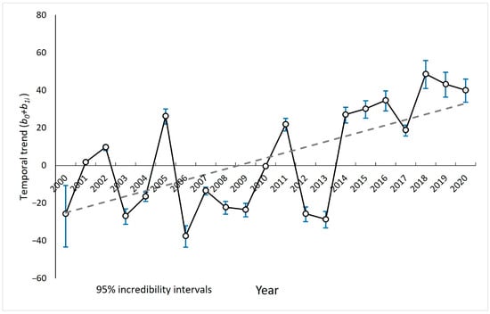 Temporal trend () of greenness of poverty-stricken areas in China from 2000 to 2020. The blue vertical line shows the credibility interval for each year.