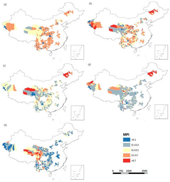 Mapping of MPI. (a–e) represent the MPI values of 2000, 2005, 2010, 2015, and 2020, respectively.
