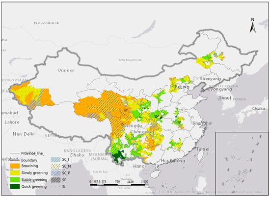 Based on the trend in greenness change, if the estimated value of of BYM model is >0, it is a positive greening trend. If the estimated value is <0, there is a browning trend. The greening level variation was divided into three levels—slow, stable, and quick—according to the natural break method. According to the spatial–temporal changes in poverty, the condition was divided into the following categories: SC (space–time coagulation), SL (space–time lock), and SF (space–time flow), which represent the spatial–temporal poverty change with the high, middle, and low degrees/possibilities. Trade-off and synergy concepts have normally been applied in ecological, human–land relationship research to identify conflicts and benefits [,]. Synergy means positive relation between two factors; on the contrary, trade-off is considered a negative relation. In this work, the relationship between greenness spatial–temporal patterns and poverty was assessed. We classified and combined the changes in greenness and spatial clustering of poverty for each category and determined the trade-off or synergy relationship categories based on a series of combinations referencing Table 3 from the paper of Zhao et al. []. The coupling relationships between greenness and poverty change are shown in Table 4. Browning with space–time lock (SL) means that when the vegetation coverage decreases negatively, there is no change in the spatial association of poverty. Any greening trend together with space–time lock (SL) was regarded as a trade-off which means that the poverty condition does not change with the greening trend. For the greening trend with different space–time change degrees with space–time flow (SF) and space–time coagulation (SC), it was regarded as a weak and strong synergy. Based on the subtypes divided in Table 3, we categorized them as follows: all the space–time coagulation types, including space–time coagulation-positive trans (SC_P), space–time coagulation-negative trans (SC_N), and space–time coagulation-irregular trans (SC_I), are regarded as strong synergy.