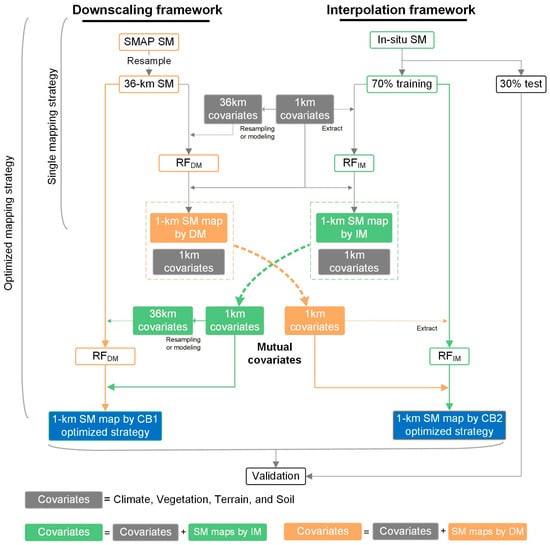 Step 2: Updating the combination of environmental covariates used in different frameworks. Based on the selected environmental covariates in this study (Table 2), different 1 km soil moisture maps were added to form updated combinations of covariates for downscaling and interpolation strategies. Specifically, for the CB1 strategy in the downscaling framework, the updated covariates consisted of all previous covariates along with the soil moisture maps generated by the IM; for the CB2 strategy in the interpolation framework, the updated covariates comprised all previous covariates in conjunction with the soil moisture maps generated by the DM.
