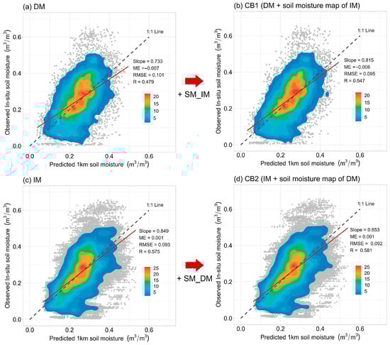 Scatter density plot of soil moisture based on RF comparing the overall accuracy of observation and prediction of (a) DM, (b) CB1, (c) IM, and (d) CB2. Red solid lines represent the linear regression fitting for the observed and predicted values, while black dashed line indicates the 1:1 line. The gray dots represent the collection of predicted values and corresponding observed values from the test set across all available time periods and sites in the independent dataset validation. The captions SM_IM and SM_DM refer to the soil moisture maps generated by the IM and DM.