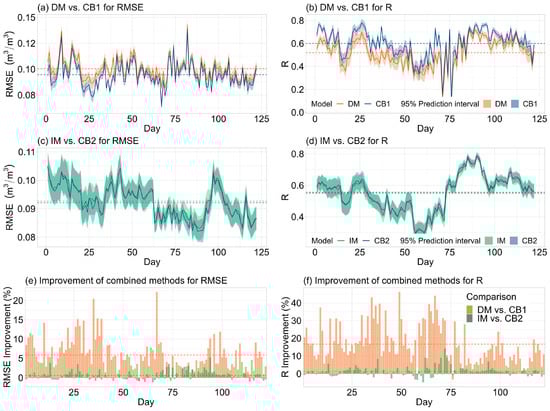 Daily prediction performance and differences for the single methods (DM and IM) and the combined methods (CB1 and CB2) using RF. (a,b): daily comparisons of RMSE and R between DM and CB1; (c,d): daily comparisons of RMSE and R between IM and CB2; (e,f): percentage improvement in RMSE and R of CB1 and CB2 relative to their respective single method (DM and IM). Day 1 corresponds to 1 June 2016. An average value over the available time periods is represented by a horizontal dashed line, and shaded areas represent the 95% prediction intervals.