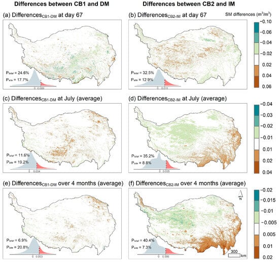 In contrast, the improvements by CB2 over the IM were more widely distributed in the TP, with 32.5% grid cells showing significant differences (Figure 5b). However, only 12.9% were close to the in situ sites. This widespread enhancement underscores the effectiveness of CB2 in leveraging downscaled data to refine interpolation across diverse geographical areas. As the analysis time scale extended, the magnitude of spatial coverage differences between methods decreased, and these differences for CB1 were increasingly concentrated in in situ sites (Figure 5c,e). The average difference over four months showed that only 6.9% of grid cells were significant, of which 20.8% came from the buffer zone around the in situ observations, suggesting that the benefits of this method are most pronounced where dense data are available. On the contrary, the optimization achieved by CB2 remained extensive across the TP; about 40.4% of the area of the TP had benefited from this improvement and was not affected by in situ observations (7.3%), indicating the broad applicability of the remote sensing data (Figure 5d,f). The spatial differences based on different frameworks were also clearly evident in the results generated by the BRT model (Figure S3).