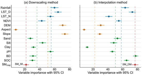 The variable importance within downscaling and interpolation frameworks for different covariates including soil moisture maps. SMmap refers to the soil moisture map produced by the DM or IM. Points indicate the daily average importance, and short lines represent the 95% confidence intervals (CIs). The mean importance of different covariate types is highlighted using vertical dashed lines in various colors.