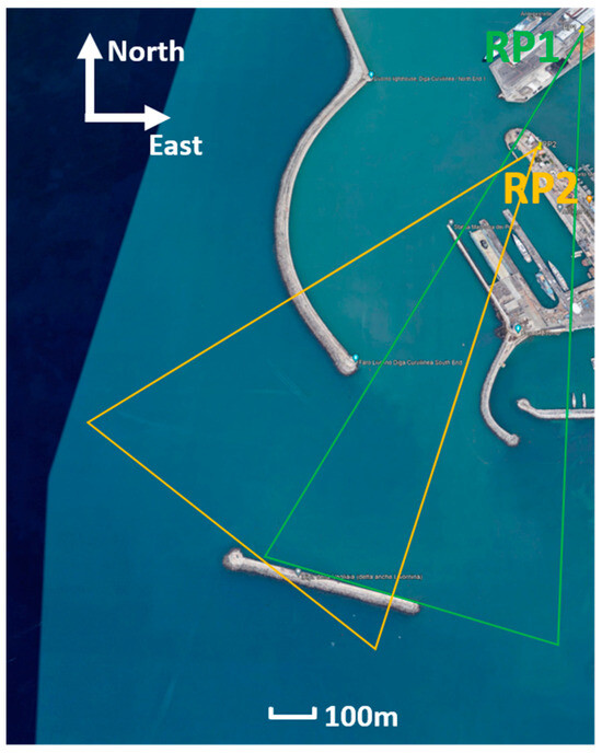 The two radar peripherals RP1 and RP2 are highlighted in green and yellow, respectively, and superimposed on a satellite image of the site, taken from Google Earth. The radar configuration allows covering a common area with some angular diversity with a corresponding bistatic angle of about 40°. More details about the MIMO radar installation on the Livorno harbor site can be found in [21].