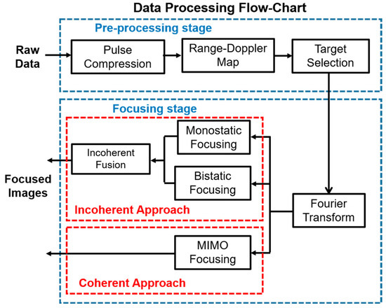 This section reports the steps and tools used to process the raw radar data in order to provide the final focused image of the target of interest. The overall signal processing procedure is reported in Figure 2, where it is possible to identify a pipeline consisting of two stages: (1) pre-processing and (2) focusing, which is based on the MWT approach, as better detailed in the following subsections.