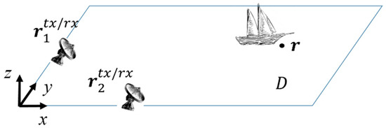 Let us refer to the 2D scenario sketched in Figure 4. Here, the two radars RP1 and RP2 probe the investigation domain D where the targets are supposed to be located. We denote with and the positions of the transmitting and receiving antennas, respectively, that are modeled for simplicity as 2D electric line sources directed along z (TM polarization) and operating in the angular frequency band . The indexes (m, n) vary over the set {1, 2}, thus defining the four radar channels, i.e.,