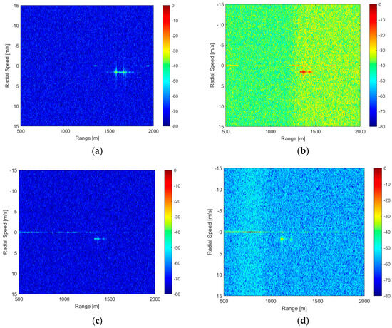 The dataset under consideration refers to a measurement campaign carried out on 23 July 2021, and it is composed of eight data frames manually recorded between 11:01:00 AM and 11:03:01 AM local time (see Table 2). Each frame comprises a number of 330 pulses that unadergo range–Doppler (RD) processing, as seen Figure 2. As an example, Figure 5 shows the pre-processed data in the RD domain relevant to Acquisition 1 for each radar channel (RP1-RP1 (a), RP1-RP2 (b), RP2-RP1 (c), and RP2-RP2 (d)). Apparently, in all the channels, the static objects can be easily distinguished from the moving targets. Note that the vertical axis of Figure 5 represents the radial speed, which is the projection of the vector representing the velocity of the target along the radar line of sight. This physical quantity is evaluated by exploiting the mathematical relation between the Doppler frequency, , and the radial velocity, .
