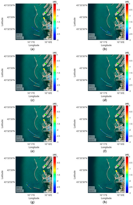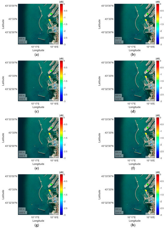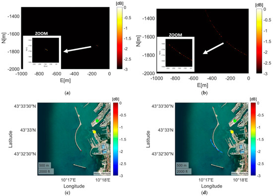 The images in Figure 7 show tomographic images of the static target achieved by processing the data relevant to Acquisition 1. Specifically, Figure 7a,b are the reconstructions in a local Cartesian reference system, while the bottom panels (Figure 7c,d) show the georeferenced reconstructions superimposed on a satellite image of the area. It turns out that both incoherent and coherent MIMO-MWT strategies provide consistent results with a peak in correspondence to the lighthouse’s location. From a careful visual analysis, it can be seen that incoherent imaging results (left panels: Figure 7a,c) are characterized by superior focusing along the azimuth that is achieved through multiplicative image fusion operation. In the following, we tackle the imaging of the moving ship.
