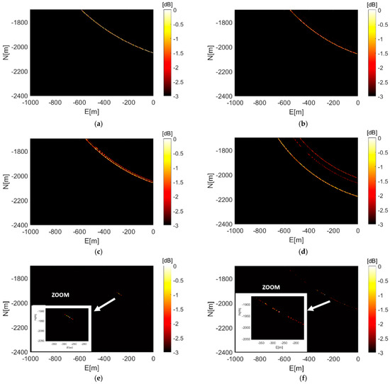 Figure 9 shows the imaging reconstructions for the monostatic (TX1-RX1, Figure 9a, and TX2-RX2, Figure 9d) and bistatic channels (TX1-RX2, Figure 9b, and TX2-RX1, Figure 9c) on the local east–north imaging plane, while the incoherent and coherent MIMO-MWT imaging results are depicted in Figure 9e,f. Owing to the measurement configuration, which causes a different backscattering from the target to the radar peripherals, the imaging results on the various channels look different. This behavior complies with the different target signatures previously observed in the range–Doppler maps of Figure 8. The reconstructions relevant to the single channels highlight that the system has a good range resolution (about 1.5 m) but a limited angular resolution due to the limited number of sensors and the large antenna beamwidth on the horizontal plane. The imaging reconstructions for both the coherent and incoherent approaches yield similar results; the target imaging contrast for the incoherent approach is better, as already shown for the static case.