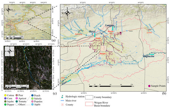 Location of the study area. (a) The study area is located in the northern section of the Tarim Basin in Xinjiang, China; (b) a detailed map of the study area, including rivers, hydrological stations, sampling points, and their types; (c) the zoomed-in Google Earth imagery of the study area and field sampling points.